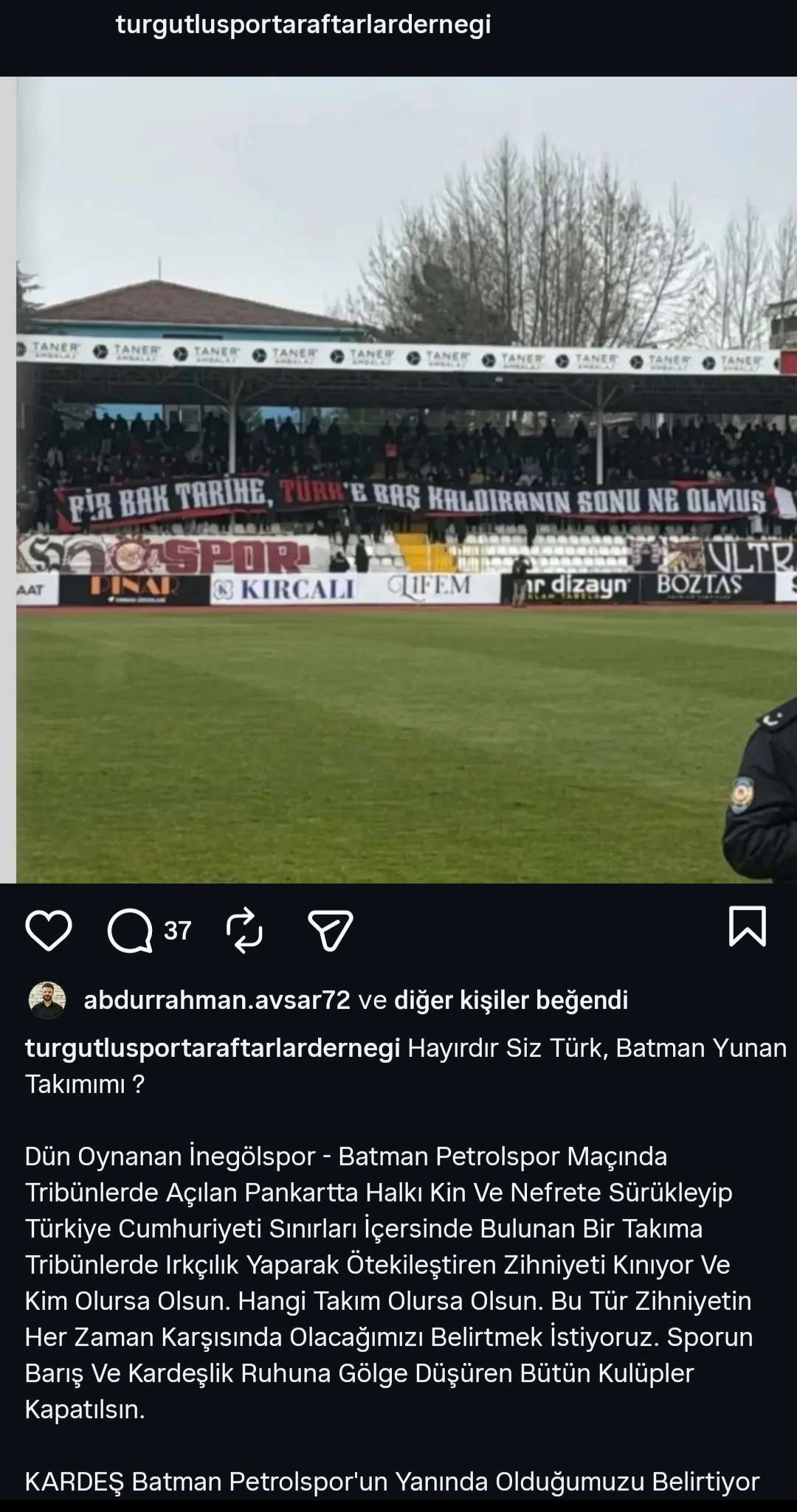 Batman Petrolspor’un deplasmanda İnegölspor ile 1-1 berabere kaldığı müsabakada, ev sahibi tribünlerinde açılan bir pankart spor kamuoyunun gündemine oturdu. Stadyuma asılan “Bir bak tarihe Türke baş kaldıranın sonu ne olmuş” yazılı ibare, halkı kin ve nefrete sürüklediği gerekçesiyle büyük tepki topladı. Irkçılık tartışmalarını beraberinde getiren bu duruma karşı ilk desteklerden biri Manisa temsilcisi Turgutluspor’un taraftarlarından geldi.